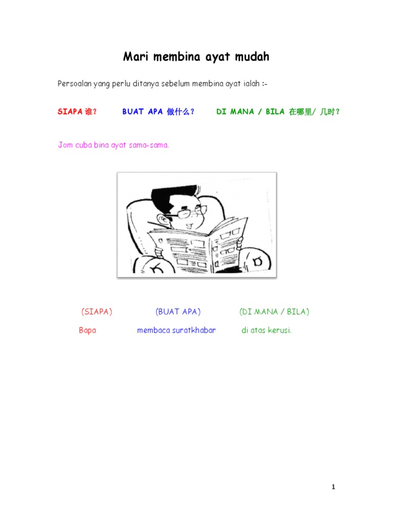 SIAPA BUAT APA DI MANA BILA Ah Leng memancing ikan. SIAPA BUAT APA DI MANA BILA Bapa membaca suratkhabar di atas kerusi. 1 of 2 Go to page.